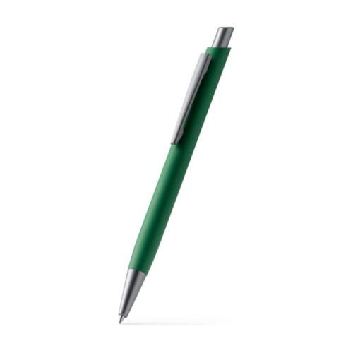 Kierrätetystä alumiinista valmistettu kynärunko ja mattametalliset yksityiskohdat. Sininen muste.