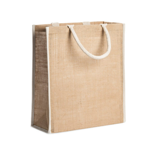 Luonnonvärinen juuttikassi, jossa reunat ja vahvistetut puuvillakahvat. Ommellut reunat.