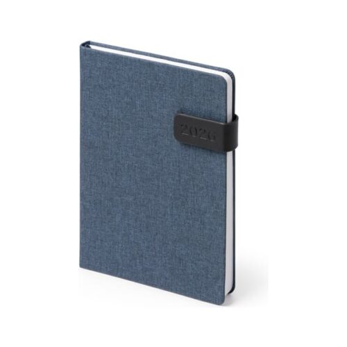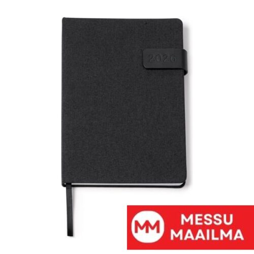 Kierrätetystä RPET-polyesteristä valmistettu A5-kokoinen päiväkirja, jossa magneettikiinnitys. 320 arkkia ja 4 sivua kartoilla. Kannen kanssa yhteensopiva värillinen sivutussi. 2+2-värinen painatus. Valkoiset arkit. Pakkaus kraft-laatikossa.
