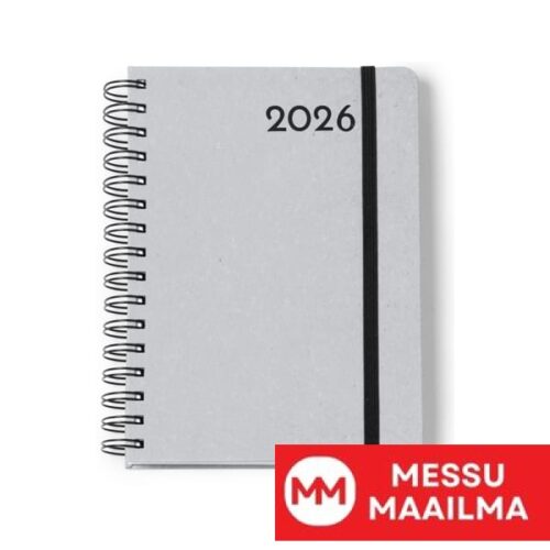 A5-kokoinen spiraalimainen rengaspäiväkirja. Kierrätetystä nahasta valmistetut kannet, joissa matalareliefi kaiverrus ja kuminauha. 348 arkkia ja 4 sivua kartoilla. Valkoiset väriarkit. Pakkaus kraft-laatikossa.