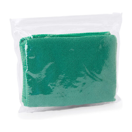 Käsipyyhe imukykyisestä 345 g/m² mikrokuitukankaasta. Pakattu uudelleenkäytettävään PVC-pussiin, jossa on ilmatiivis tiiviste.