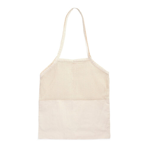Ekologinen hedelmäpussi, valmistettu 100 % puuvillasta, luonnonvärinen, 60 cm pitkillä kahvoilla. 180 g/m². Puolet pussista pehmeää materiaalia ja puolet verkkoa.
