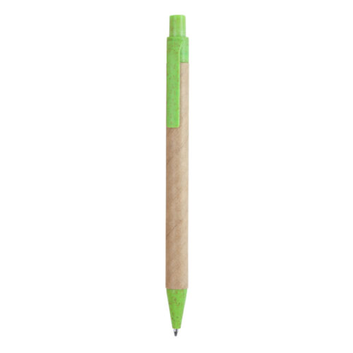 Kierrätetystä pahvista valmistettu kynä, jonka kärki ja klipsi ovat vehnäkuitua ja ABS-muovia. Sininen muste.