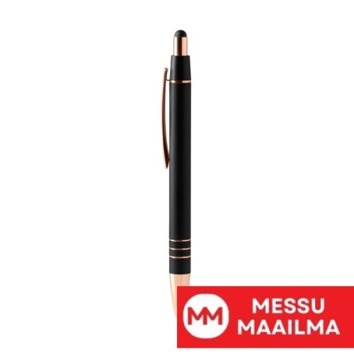 Painonappikynä, jossa mattapintainen metallinen runko ja kuparikaapelit. Kosketusosoitin painikkeessa. Jumbo-musteen täyttöpakkaus sinisenä.