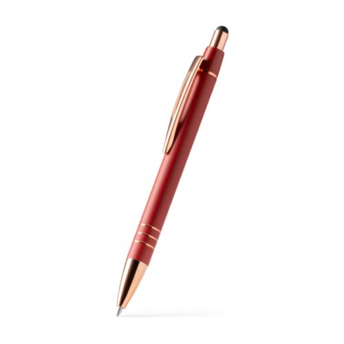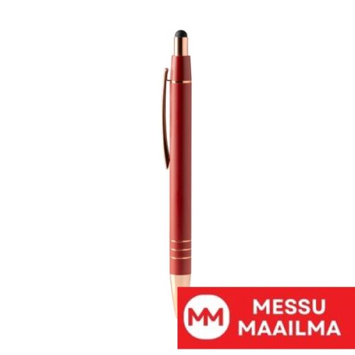 Painonappikynä, jossa mattapintainen metallinen runko ja kuparikaapelit. Kosketusosoitin painikkeessa. Jumbo-musteen täyttöpakkaus sinisenä.