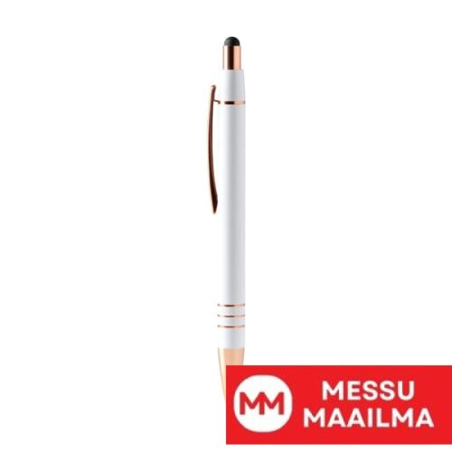 Painonappikynä, jossa mattapintainen metallinen runko ja kuparikaapelit. Kosketusosoitin painikkeessa. Jumbo-musteen täyttöpakkaus sinisenä.