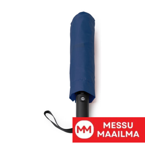 Taittuva myrskyvarjo, jossa on automaattinen avautuminen ja kuminen kahva. 190T pongee-kangasta ja yhteensopiva pussi. Mustat lasikuituiset kaaret.