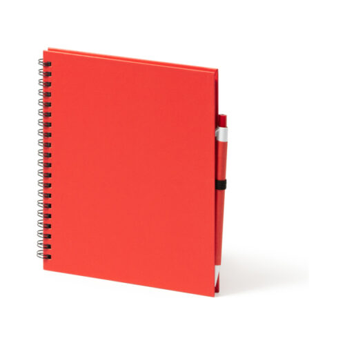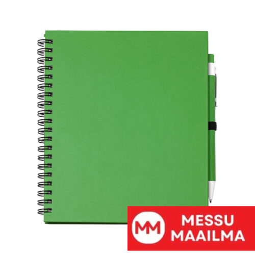 Spiraalimainen rengasmuistikirja, jossa on yksiarkkeja ja kynäteline. Kovat kannet ja yhteensopiva kierrätetystä pahvista tehty kynä. 70 sivua.