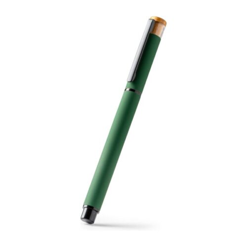 Kuulakärkikynä, jossa kierrätetystä alumiinista valmistettu runko, metallinen klipsi ja bambukoristeet. Jumbo-mustesäiliö sinisenä.