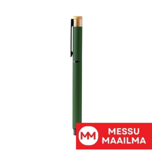 Kuulakärkikynä, jossa kierrätetystä alumiinista valmistettu runko, metallinen klipsi ja bambukoristeet. Jumbo-mustesäiliö sinisenä.