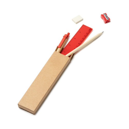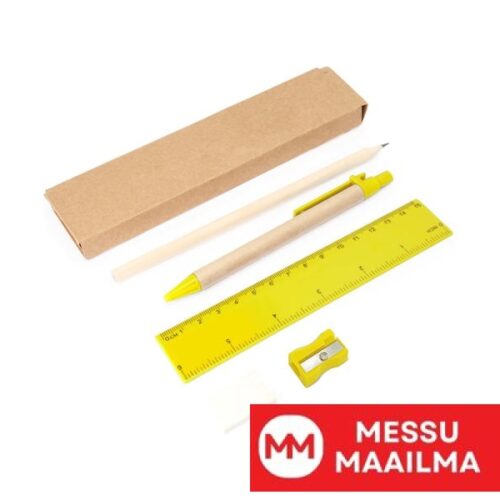5-osainen setti, joka sisältää pahvirungolla ja sinisellä musteella varustetun kuulakärkikynän, puisen lyijykynän, teroittimen, pyyhekumia ja 15 cm viivaimen.