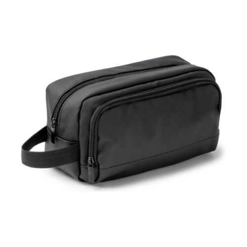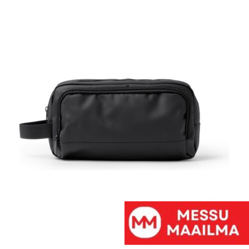 PU-nahkainen meikkilaukku, jossa kaksi lokeroa ja vetoketjukiinnitys. Mukana kantokahva.