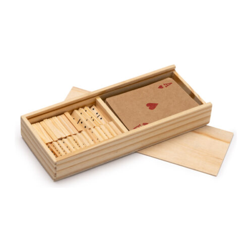 2 pelin setti: kierrätetystä pahvista tehty korttipakka ja puinen domino. Toimitetaan puulaatikossa.