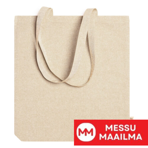 140 g/m² kierrätyspuuvillasta valmistettu laukku, jossa meleerattu pinta ja 70 cm pitkät kahvat.