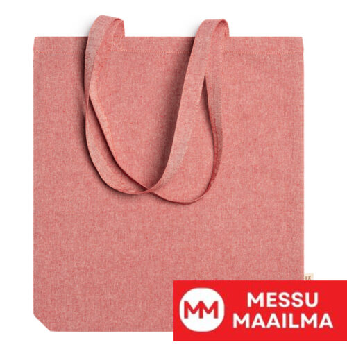 140 g/m² kierrätyspuuvillasta valmistettu laukku, jossa meleerattu pinta ja 70 cm pitkät kahvat.