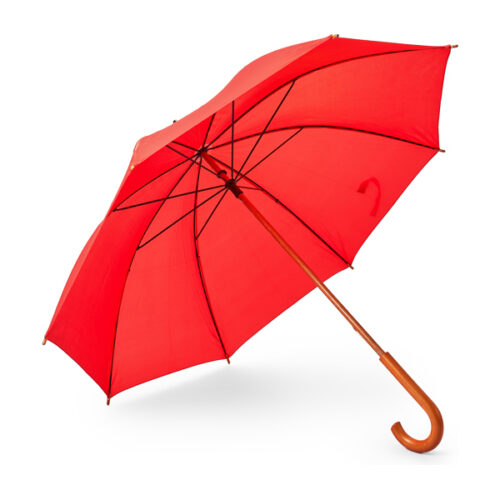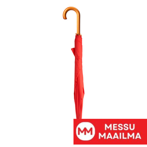 Sateenvarjo, jonka kahva, varsi ja kärjet ovat puuta. Mustat kaaret. Yhteensopiva tarranauhakiinnitys. Manuaalinen avaus. Halkaisija 105 cm.