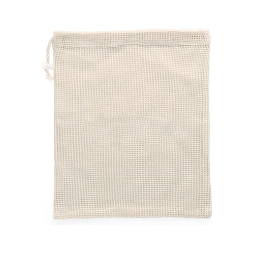 Ekologinen hedelmäpussi, valmistettu 100 % puuvillasta, luonnonvärinen. 120 g/m². Pussin toinen puoli pehmeää puuvillaa ja toinen ohutta verkkokangasta. Kiristysnyörikiinnitys läpinäkyvällä muovisäätimellä.