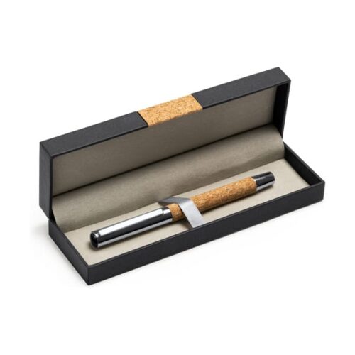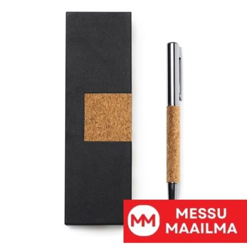 Mainosmainen roll-on-kynä luonnonkorkista ja teräksestä. Pakattu eleganttiin korkkikoteloon, jossa on pehmustettu sisävuori.