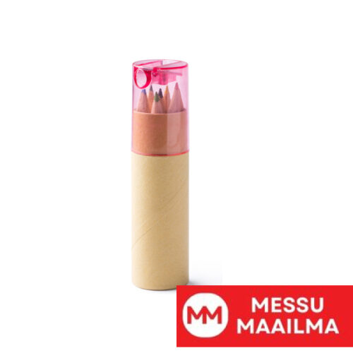 Puinen 6 kynän setti kierrätetystä pahvista valmistetussa kotelossa, jossa läpikuultava värillinen korkki. Korkissa sisäänrakennettu teroitin. Saatavilla eri väreissä.