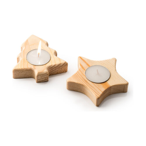 Kynttilä, jossa on puinen astia kahdessa jouluaiheessa (tähti ja puu).