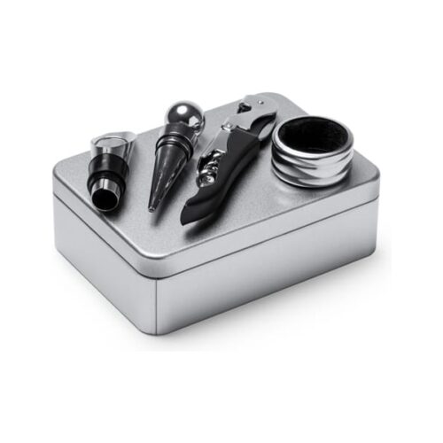Viinisarja ruostumattomasta teräksestä valmistetuilla varusteilla: pulltap-korkkiruuvi taittuvalla terällä, tipparengas, tulppa ja kaatonokka.