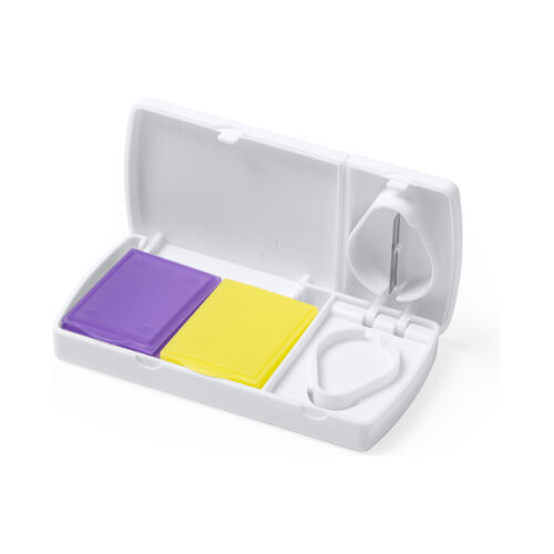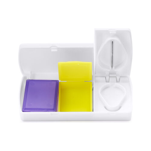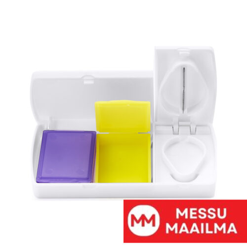 Kaksiosainen tablettirasia: toisessa kaksi kaksiväristä rasiaa ja toisessa leikkuri suurempien tablettien jakamiseen.
