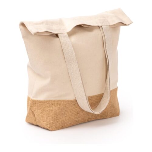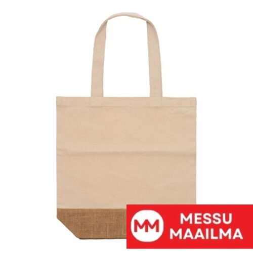 Laukku 330 g/m² kierrätyspuuvillaa ja luonnonkuitua. 70 cm pitkät kahvat.