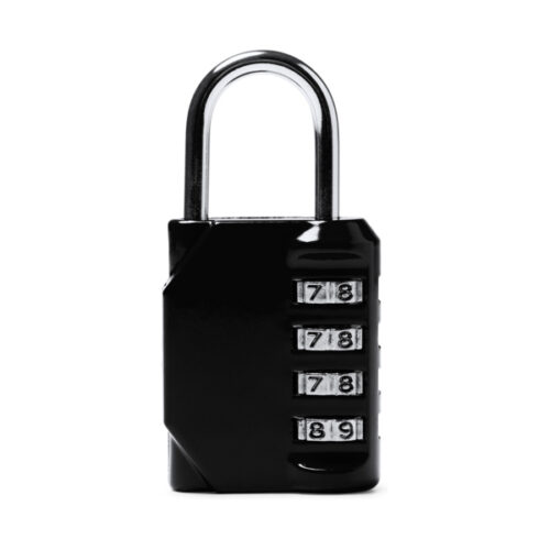 Riippulukko, jossa on nelinumeroinen numerosarja. Runko ja kahva ruostumatonta terästä.