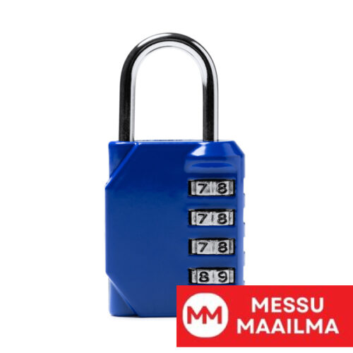 Riippulukko, jossa on nelinumeroinen numerosarja. Runko ja kahva ruostumatonta terästä.