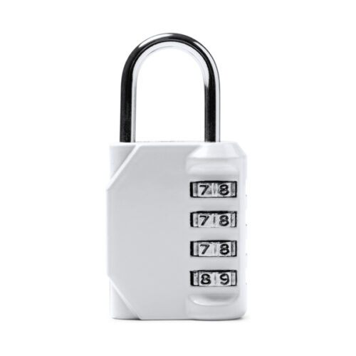 Riippulukko, jossa on nelinumeroinen numerosarja. Runko ja kahva ruostumatonta terästä.