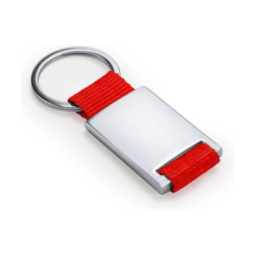 Metallinen avaimenperä, jossa värillinen polyesterihihna.