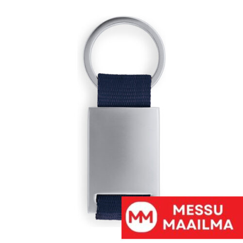 Metallinen avaimenperä, jossa värillinen polyesterihihna.