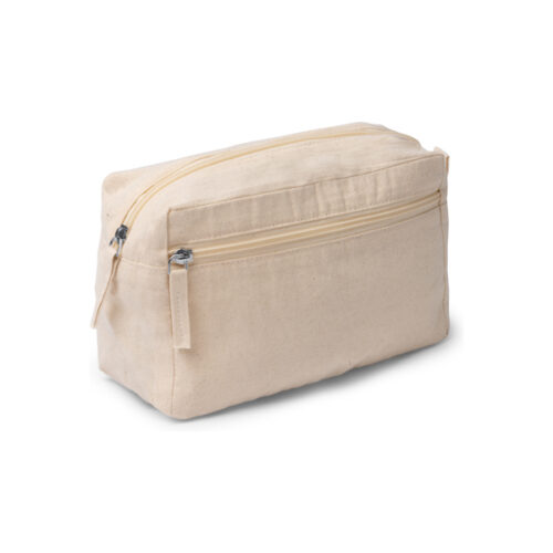 Meikkilaukku 100 % puuvillaa 150 g/m², vetoketjukiinnitys. Kaksi taskua, päätasku ja sivutasku.