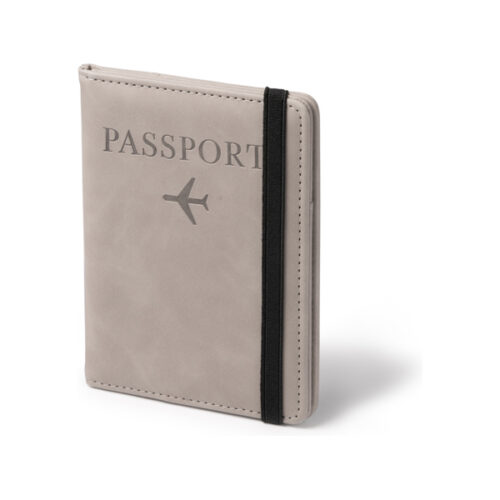 PU-muovista valmistettu passinsuoja, jossa joustava nauha sulkemista varten. Kolme sisätaskua passille ja asiakirjoille, neljä taskua korteille ja kaksi SIM-korteille.