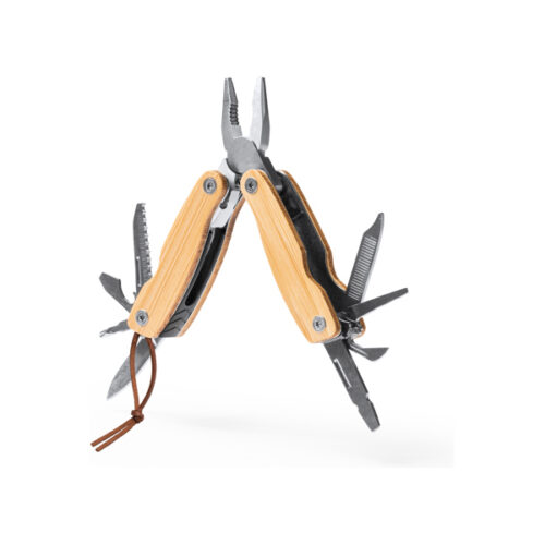Monitoimityökalu, jossa on ruostumattomasta teräksestä valmistettu runko ja lisävarusteet sekä bambukahva. 12 toimintoa: partakone, saha, viila, avaaja, ruuvimeisseli ja pihdit. Mukana kantohihna.