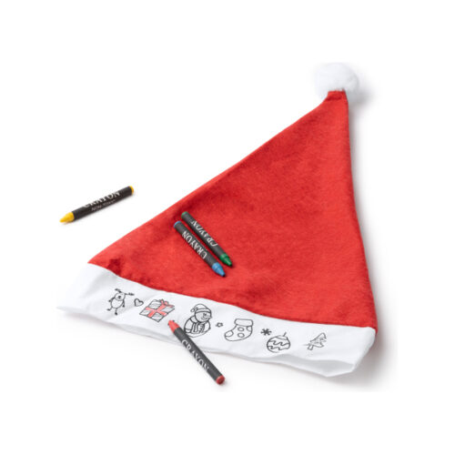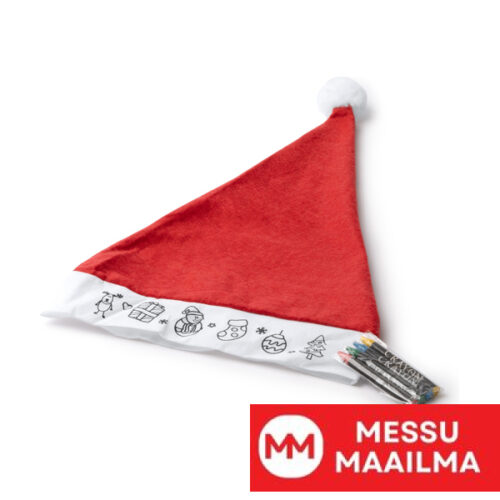 Lasten joululakki väritykseen. Jouluisia kuvioita valkoisen nauhan etupuolella. Mukana 4 väriliitua (punainen, keltainen, vihreä ja sininen).
