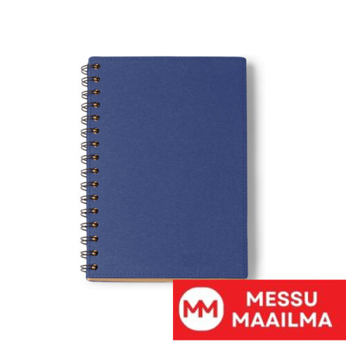 A5-kokoinen muistikirja kierrätyspahvista, jossa on kaksinkertainen spiraalirengas. FSC-kierrätyspaperista valmistettuja arkkeja. 60 viivoitettua arkkia.
