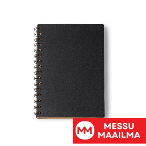 A5-kokoinen muistikirja kierrätyspahvista, jossa on kaksinkertainen spiraalirengas. FSC-kierrätyspaperista valmistettuja arkkeja. 60 viivoitettua arkkia.