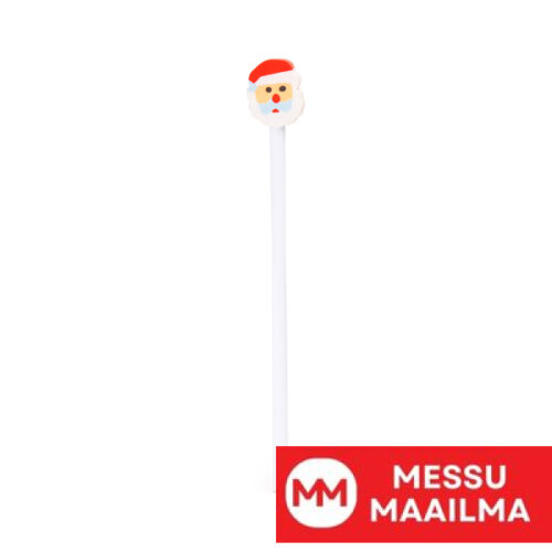 Pyöreä valkoinen puinen kynä kumilla, saatavilla kolmessa jouluaiheessa: puu, joulupukki ja lumiukko.