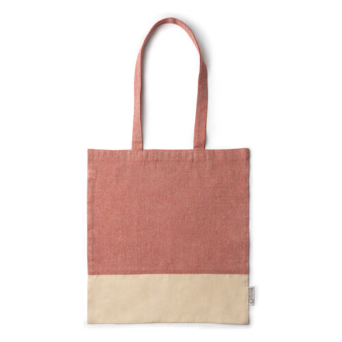 Kierrätetystä puuvillasta valmistettu kassi, jossa on meleerattu pinta ja 120 g/m² luonnonpuuvillaa. Vahvistetut 70 cm pitkät kahvat.