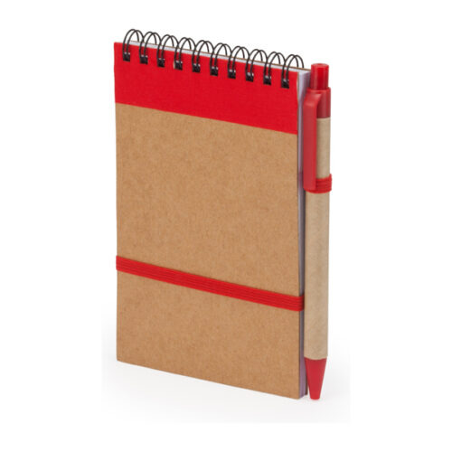 Spiraalimainen rengasmuistikirja, jossa on kierrätetystä pahvista valmistetut kovat kannet. Mukana yhteensopiva kynä sinisellä musteella. 70 sivua.