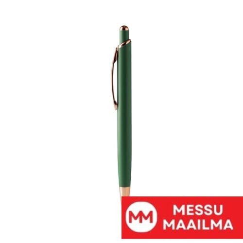 Painonappikuulakärkikynä, jossa mattapintainen metallirakenne ja kupariviimeistelyt. Jumbo-täyttöpakkaus sinisellä musteella.