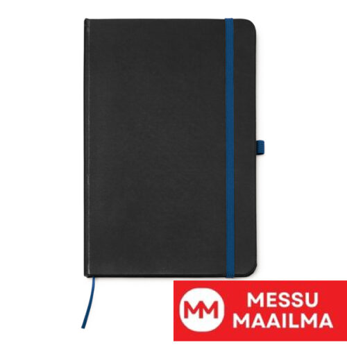 A5-kokoinen muistikirja kovakantisilla mustilla PU-kansilla. Värillinen kirjanmerkki, kuminauha ja kynäteline. 80 viivoitettua sivua.