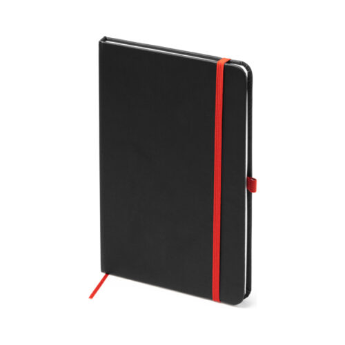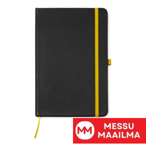 A5-kokoinen muistikirja kovakantisilla mustilla PU-kansilla. Värillinen kirjanmerkki, kuminauha ja kynäteline. 80 viivoitettua sivua.