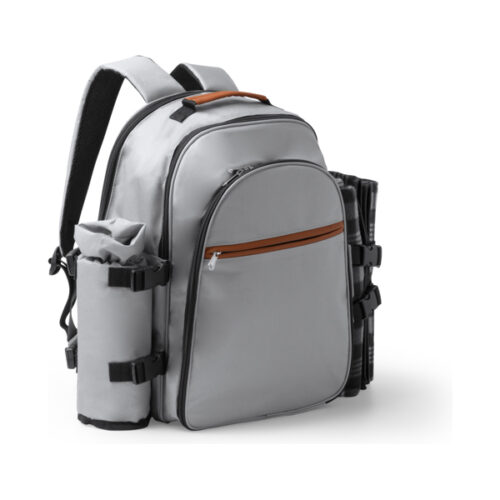 Piknikreppu RPET-polyesteriä. Päälokero, jossa: 2 mukia, 2 lautasta ja 2 aterinsettiä. Toinen sivulokero piknikviltille (sisältyy pakettiin) ja toinen sivulokero pulloille.