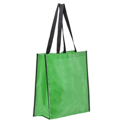 Uudelleenkäytettävä kassi kiiltävällä laminoidulla pinnalla. Kestävästä materiaalista valmistettu, vahvistetuilla nailonkahvoilla ja yhteensopivalla mustalla tereellä.
