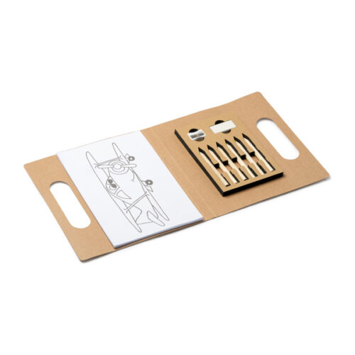 Hauska lasten piirustussarja, jolla voi piirtää missä tahansa. Mukana piirustusalusta, 6 värikynää, teroitin ja kumi.