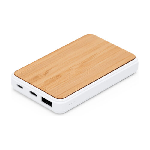 5000 mAh ulkoinen akku, suorakaiteen muotoinen valkoinen ABS-runko ja bambupinta. C-tyypin virranulostulo. Mukana micro-USB-kaapeli.