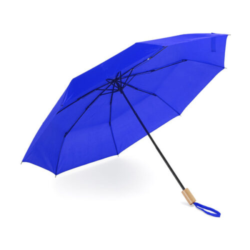 Taittuva RPET-sateenvarjo ja siihen sopiva pussi. Musta varsi, harjat ja kärjet. Luonnonpuusta valmistettu kahva, yhteensopiva tarranauhakiinnitys ja manuaalinen avaus. Halkaisija 95 cm.