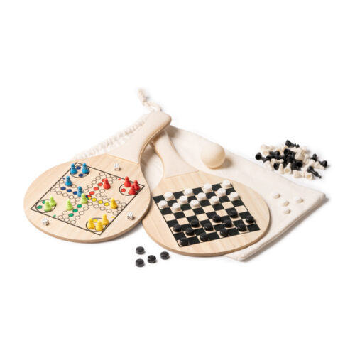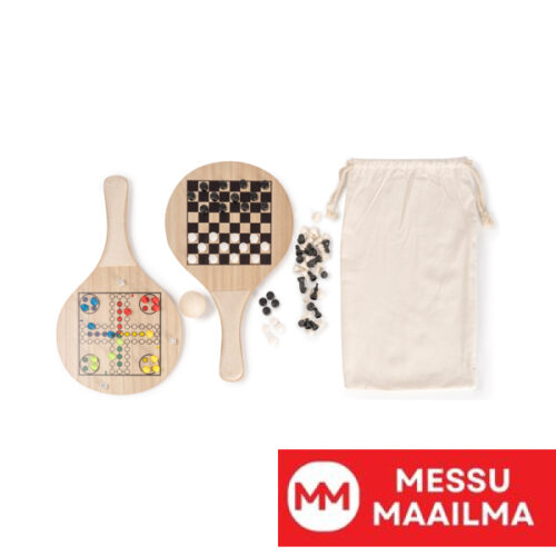 Puusta ja vehnäkuidusta valmistettu rantalapiosarja. Sisältää moninpelin: shakin ja parcheesin.